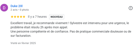 Intervention en urgence avec un problème résolu en moins de 2 heures.